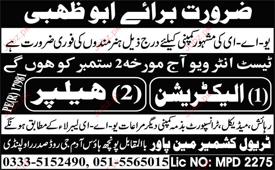 Electrician and Helper Job Opportunity in Abu Dhabi