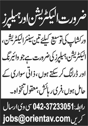 Electrician and Helper required at Workshop in Lahore