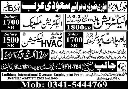 Vacant posts including electrician mechanic, power plant operator, electrician and hvac technician are announced in Ludhiana International Overseas Employment Promoters Riyadh, riyadh Saudi Arabia as per 11 August 2024 advertisement in daily Express Newspaper. Preferred Education is Matric, Primary and Middle etc.