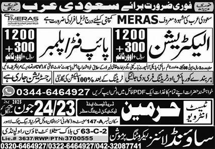 Sound Lines Recruiting Promotion Riyadh, riyadh Saudi Arabia invites applications from eligible candidates for the post of pipe fitter, electrician and plumber as per advertisement of June 15, 2025 published in daily Express Newspaper. Preferred Education is Middle etc.