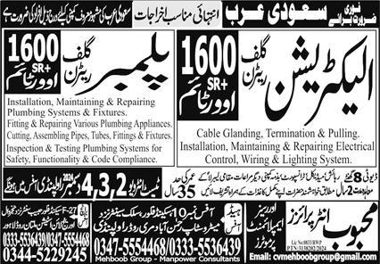 Mehboob Enterprises Overseas Employment Promoters jobs advertisement dated about 1 December 2024 in daily Express Newspaper invites application for the vacant post of plumber and electrician in Saudi Arabia, saudi arabia Saudi Arabia. Candidates with Middle, Matric and Primary etc. educational background will be preferred.
