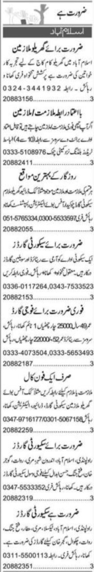 Private jobs advertisement dated about 12 January 2023 in daily Express Newspaper invites application for the vacant post of electrician, cook, house maid, civilian guard, receptionist, chowkidar, house servant, driver, office boy, fauji guard and security guard in Islamabad, islamabad Islamabad Pakistan. Persons with Intermediate, Primary, Middle and Matric etc. education can apply.