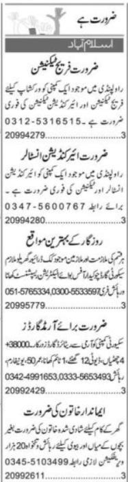 Private Company Islamabad, rawalpindi Islamabad Pakistan invites applications from eligible candidates for the post of office boy, driver, armed guard, fridge technician, house servant, air condition technician, security guard, receptionist, electrician, house worker, chowkidar, cook and air condition installer as per advertisement of December 17, 2025 published in daily Express Newspaper. Candidates with Intermediate, DAE, Middle and Matric etc. educational background will be preferred.