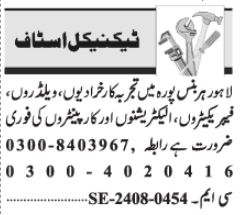 Private Industry jobs advertisement dated about 14 August 2024 in daily Jang Newspaper invites application for the vacant post of welder, lathe machine operator, fabricator, electrician and carpenter in Lahore, lahore Punjab Pakistan. Preferred Education is Middle, Matric and Intermediate etc.