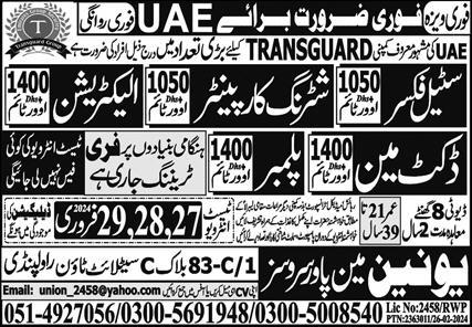 Vacant posts including steel fixer, shuttering carpenter, electrician, plumber and docket man are announced in Union Manpower Services Abu Dhabi, sharjah UAE as per 27 February 2024 advertisement in daily Express Newspaper. Intermediate and Matric etc. educational qualification will be preferred.