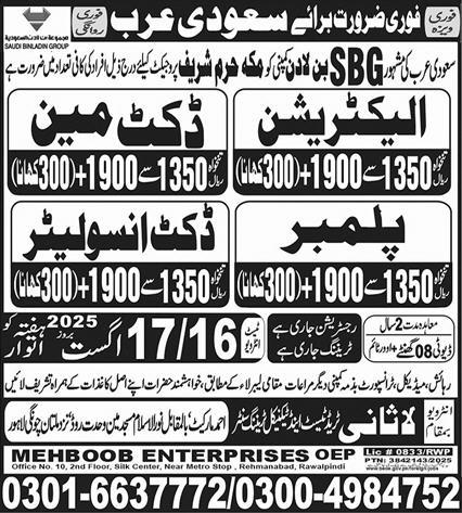Lasani Trade Test & Technical Training Center jobs advertisement dated about 16 August 2025 in daily Express Newspaper invites application for the vacant post of duct man, electrician, duct insulator and plumber in Makkah, madina Saudi Arabia. Candidates with Matric, Intermediate and Bachelor etc. educational background will be preferred.