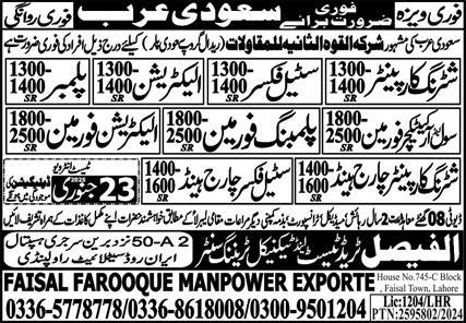 Al Faisal Trade Test & Technical Training Center latest Overseas Construction jobs and others can be applied till January 23, 2025 or as per closing date in newspaper ad. Read complete ad online to know how to apply on latest Al Faisal Trade Test & Technical Training Center job opportunities. Salary varies from 184000. Extra hours work allowed to earn more. Free accommodation, medical and transport may be available.