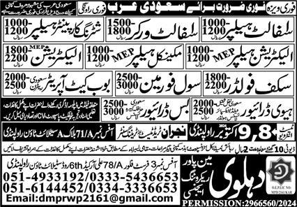 Vacant posts including bobcat operator, civil foreman, electrician helper mep, mechanical helper mep, htv driver, driver, mechanical helper, shuttering carpenter helper, electrician helper, electrician, bus driver, scaffolder, asphalt worker, heavy driver and asphalt helper are announced in Dahlawi Manpower Recruiting Riyadh, dammam Saudi Arabia as per 4 October 2024 advertisement in daily Express Newspaper. DAE, Middle, Matric, Bachelor and Intermediate etc. educational qualification will be preferred.