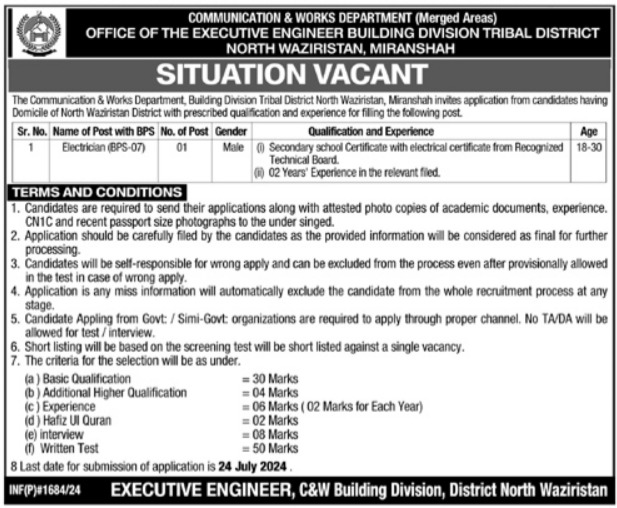 Building Division is looking for candidates for following posts as per job advertisement published in daily Mashriq Newspaper of July 16, 2024 for location Miran Shah, miran shah Khyber Pakhtunkhwa KPK Pakistan: