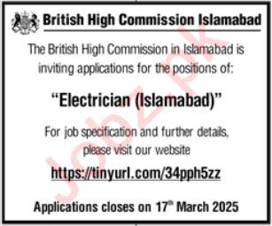 Vacant posts including electrician are announced in British High Commission Islamabad G-5 Islamabad, islamabad Islamabad Pakistan as per 9 March 2025 advertisement in daily Jang Newspaper. Candidates with Matric and Middle etc. educational background will be preferred.