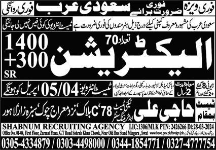 Shabnum Recruting Agency latest Overseas Manufacturing jobs and others can be applied till April 5, 2024 or as per closing date in newspaper ad. Read complete ad online to know how to apply on latest Shabnum Recruting Agency job opportunities. Some jobs in Shabnum Recruting Agency may require skills like Electric Repair and Electricians. Salary varies from 127000. Earn more by overtime. Facilities like medical, transport, food and accommodation may be provided.