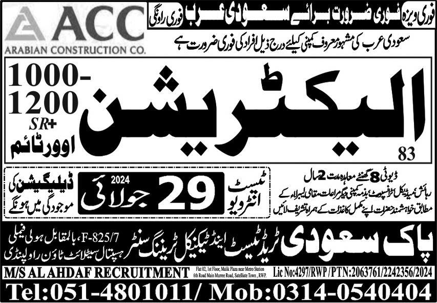 Pak Saudi Trade Test & Technical Training Center jobs advertisement dated about 25 July 2024 in daily Express Newspaper invites application for the vacant post of electrician in Makkah, madina Saudi Arabia. Candidates with Matric and Intermediate etc. educational background will be preferred.