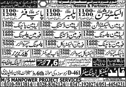 Vacant posts including electrician, plumber, foreman electrical, foreman ducting, pipe fitter, plumbing supervisor, foreman plumbing, lead man plumbing, lead man electrician, lead man ducting, lead man piping and forman piping are announced in ManPower Project Service Saudi Arabia, saudi arabia Saudi Arabia as per 28 October 2024 advertisement in daily Express Newspaper. Persons with Matric, DAE, Intermediate and Bachelor etc. education can apply.