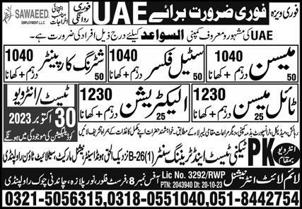 Vacant posts including electrician, shuttering carpenter, mason, tile mason and steel fixer are announced in Pk Tech Ni Test Overseas and local Employment and Training Institute Abu Dhabi, sharjah UAE as per 27 October 2023 advertisement in daily Express Newspaper. Persons with Matric and Intermediate etc. education can apply.