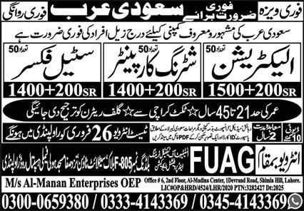 Electrician & Shuttering Carpenter Jobs 2025 in Saudi Arabia