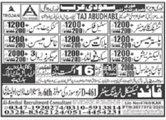 Vacant posts including block mason, steel fixer, plaster mason, electrician, chargehand civil, concrete mason, rigger, tile mason, scaffolder and shuttering carpenter are announced in Quaid Technical Training Center Dammam, riyadh Saudi Arabia as per 13 August 2025 advertisement in daily Mashriq Newspaper. Educational qualifications required Matric, Bachelor and Intermediate etc.