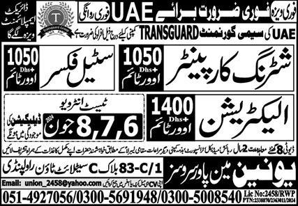 Union Manpower Services Abu Dhabi, sharjah UAE invites applications from eligible candidates for the post of shuttering carpenter, steel fixer and electrician as per advertisement of June 5, 2024 published in daily Express Newspaper. Candidates with Middle and Matric etc. educational background will be preferred.