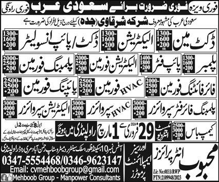 Mehboob Enterprises Overseas Employment Promoters Jeddah, dammam Saudi Arabia invites applications from eligible candidates for the post of docket man, pipe insulator, hvac foreman, pipe fitter, electrical foreman, plumbing fire fighter supervisor, plumber, electrician, docket insulator, piping foreman, fire fighting foreman, camp boss, electrician foreman, hvac supervisor, electrical supervisor and plumbing foreman as per advertisement of February 22, 2024 published in daily Express Newspaper. Persons with Intermediate, B.E, Matric, Bachelor, DAE and BA etc. education can apply.