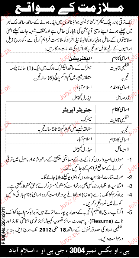 Apply as per details in job advertisement. Login to view further details of how to apply via https://www.jobz.pk online.