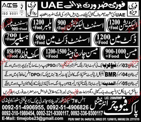 Electricians, Assistant Electricians, Assistant Plumbers, Mason Assistant Dutchman, Mason Charge Hand and Scaffolds ar required in UAE.