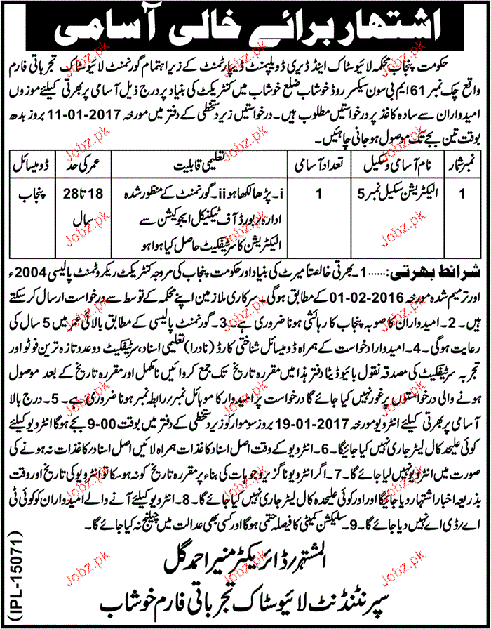 Electricians Job In Punjab Livestock And Dairy Development