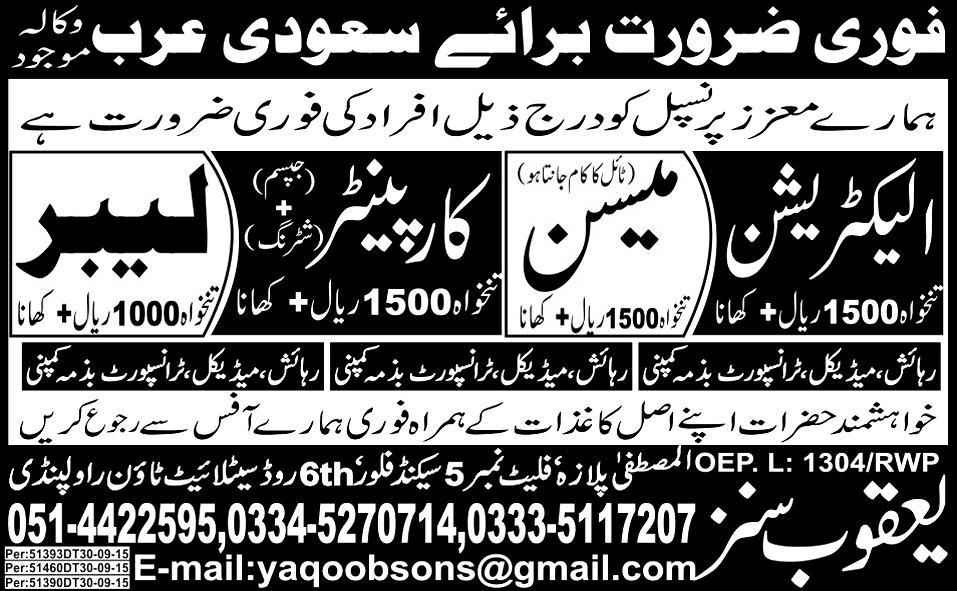 Electricians, Mason, Carpenters and Labors Job Opportunity