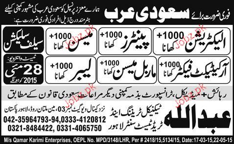 Electricians, Painters, Mason, Architect, Labors Wanted