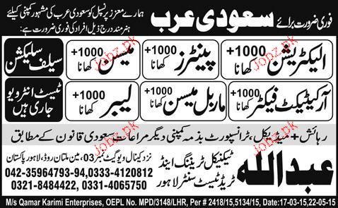 Electricians, Painters, Mason, Marble Mason Job Opportunity