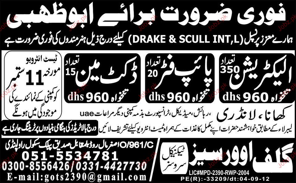 Electricians, Pipe Fitters and Ducktman Job Opportunity