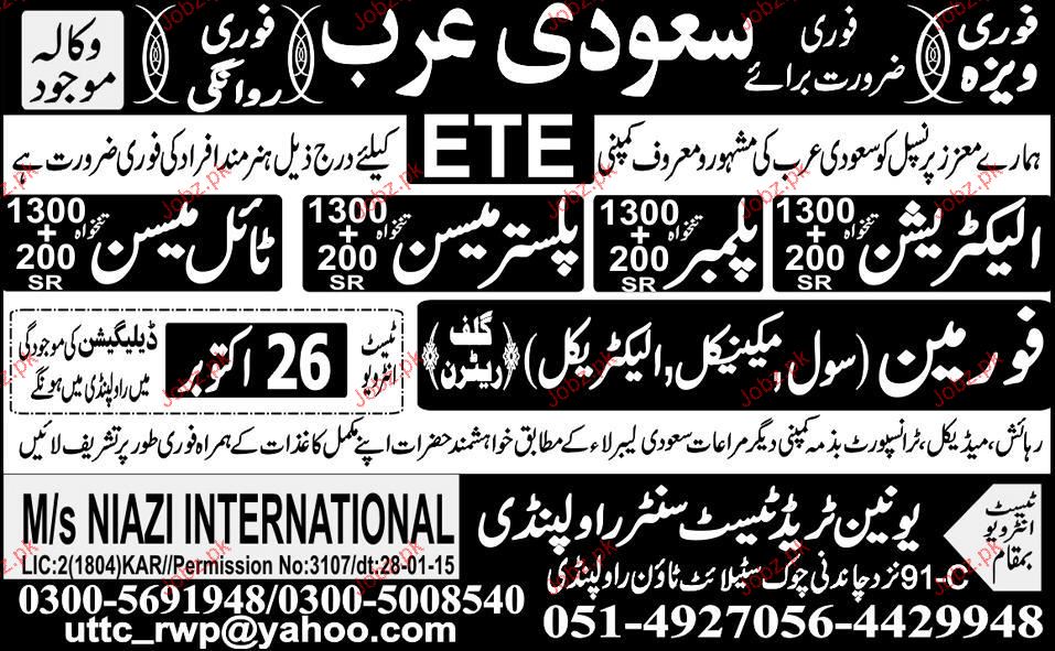 Electricians, Plumbers, Tile Mason, Foreman Job Opportunity