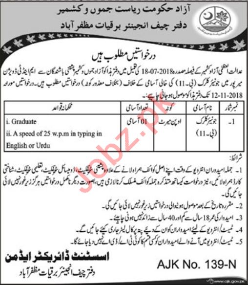 Electricity Department AJK Jobs 2018 for Junior Clerk