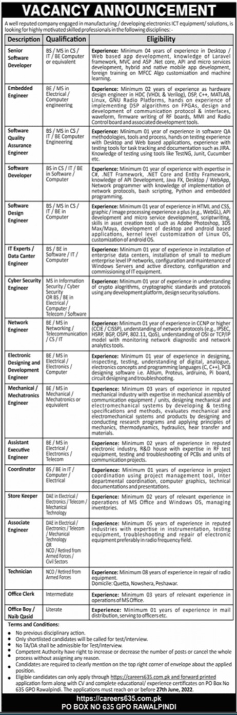 Electronics Company is looking for candidates for following posts as per job advertisement published in daily Jang Newspaper of June 13, 2022 for location Rawalpindi, rawalpindi Punjab Pakistan:
