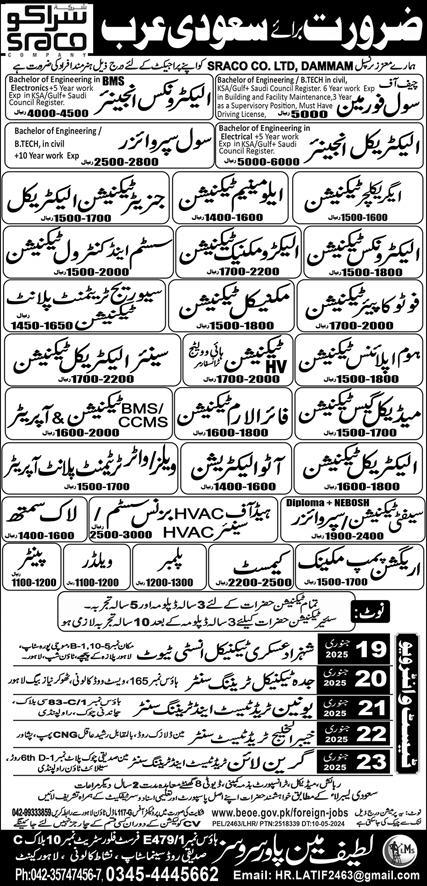 Vacant posts including hv technician, civil supervisor, medical gas technician, aluminum technician, civil foreman, generator technician electrical, painter, photocopier technician, bms operator, agriculture technician, electro mechanic technician, electronics technician, irrigation pump mechanic, hvac technician, lock smith, electrical engineer, plumber, system control technician, sewerage treatment plant technician, safety supervisor, auto electrician, ccms operator, water treatment plant operator, mechanical technician, welder, chemist, ccms technician, electrical technician, fire alarm technician, bms technician, safety technician, electronics engineer and home appliances technician are announced in Latif Manpower Services Dammam, riyadh Saudi Arabia as per 17 January 2025 advertisement in daily Express Newspaper. Intermediate, B.E, Matric, DAE, Bachelor, Middle and BA etc. educational qualification will be preferred.