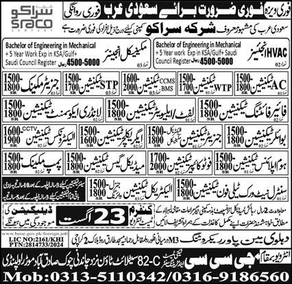 Dahlwi Manpower Recruiting latest Overseas Industrial jobs and others can be applied till August 23, 2024 or as per closing date in newspaper ad. Read complete ad online to know how to apply on latest Dahlwi Manpower Recruiting job opportunities. Skills in Mechanical Engineering, Fire Fighting, Engineering and HVAC may be preferred for these Dahlwi Manpower Recruiting jobs. Salary varies from 366000. Earn more by overtime. Free accommodation, medical and transport may be available.