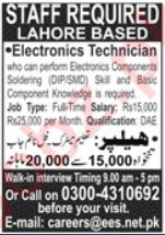 Private Company Lahore, lahore Punjab Pakistan invites applications from eligible candidates for the post of electronics technician and helper as per advertisement of October 16, 2022 published in daily Jang Newspaper. Preferred Education is Middle, Intermediate, DAE and Matric etc.