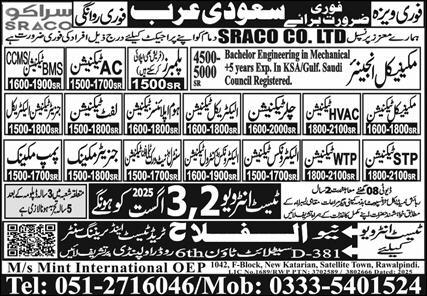 New Al Falah Trade Test & Training Center Dammam, al khobar Saudi Arabia invites applications from eligible candidates for the post of home appliances technician, ac technician, chiller technician, mechanical engineer, plumber, engineer, generator mechanic, mechanical technician, electronics technician, stp technician, electrical technician, electronics control technician, hvac technician, lift technician, generator technician electrical, central network technician, ccms technician, pump mechanic, bms technician, wtp technician and telephone technician as per advertisement of August 1, 2025 published in daily Express Newspaper. Persons with B.E, Others, Bachelor, DAE, Intermediate and Matric etc. education can apply.