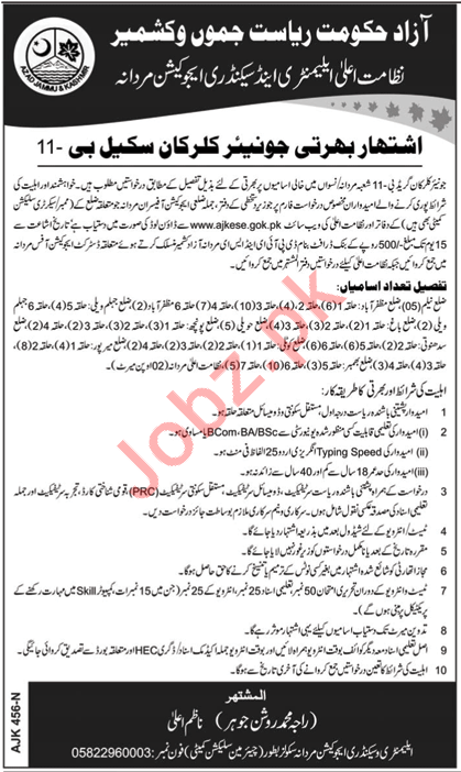 Latest Elementary and Secondary Education Department ESED Admin Clerical Posts Muzaffarabad 2025