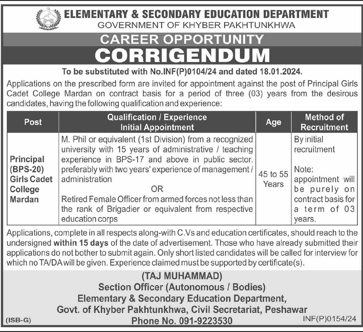 Girls Cadet College Mardan, Elementary and Secondary Education Department ESED Mardan, peshawar Khyber Pakhtunkhwa KPK Pakistan invites applications from eligible candidates for the post of principal as per advertisement of January 26, 2024 published in daily Dawn Newspaper. Mphil and Master etc. educational qualification will be preferred.