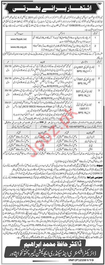 Elementary and Secondary Education Department ESED is inviting application from experienced and energetic candidates for the post of Secondary School Teacher SST Biology, Secondary School Teacher SST Physics, Secondary School Teacher SST General, Secondary School IT Teacher in Peshawar, Mardan, Nowshera, bannu, Tabnk, Lucky Marwat, Dera Ismail Khan, Swat, Chitral, Malakand, Boner, Abbottabad, Mansehra . Candidates can apply till June 10, 2019.