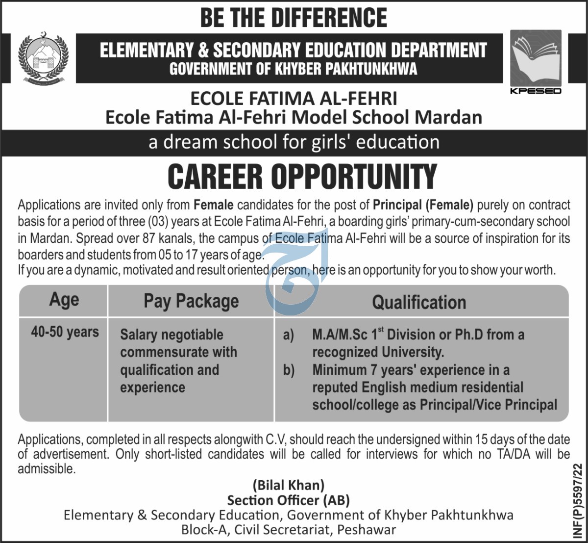 Elementary and Secondary Education Department ESED Mardan, mardan Khyber Pakhtunkhwa KPK Pakistan invites applications from eligible candidates for the post of principal as per advertisement of September 24, 2022 published in daily Aaj Newspaper. Preferred Education is M.sc, Master, Bachelor and MA etc.