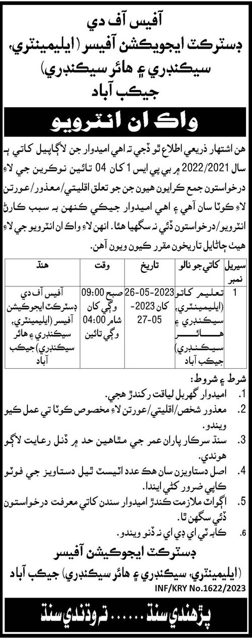 Elementary Secondary & Higher Secondary Jacobabad Jobs 2023