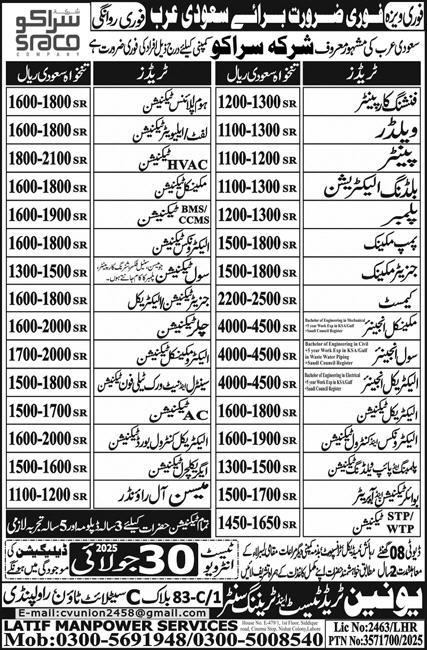 Vacant posts including elevator technician, chiller technician, generator technician electrical, ccms technician, mason, engineer, mechanical engineer, pipe welding technician, generator mechanic, ac technician, building electrician, electronics control technician, chemist, electrical technician control board, electro mechanical technician, home appliances technician, wtp technician, pump mechanic, boiler technician, civil technician, civil engineer, finishing carpenter, electrical technician, electronics technician, lift technician, mechanical technician, painter, electrical engineer, agriculture technician, boiler operator, plumber, bms technician, hvac technician, stp technician, generator technician, central network telephone technician, steel fixer, shuttering carpenter and plumbing technician are announced in Union Trade Test and Training Center Dammam, riyadh Saudi Arabia as per 23 July 2025 advertisement in daily Express Newspaper. Educational qualifications required Intermediate, DAE, Matric, Others, B.E and Bachelor etc.