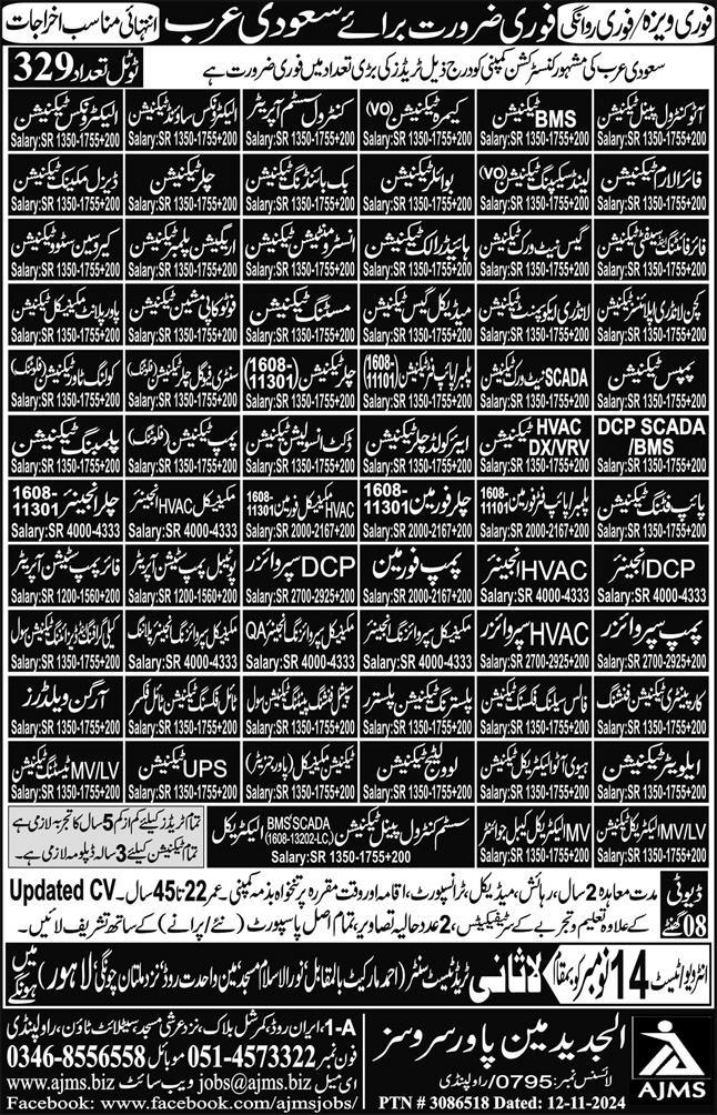 Vacant posts including air cooled chiller technician, pipe fitter foreman, hvac engineer, photocopy machine technician, pump foreman, land scaping technician, vrv technician, mechanical supervising engineer, fire fighting technician, misting technician, hydraulic technician, potable pump station operator, chiller engineer, technician mechanical, pump technician, dx technician, low voltage technician, pipe fitter technician, elevator technician, pumps technician, plumber, boiler technician, pump supervisor, power plant mechanical technician, diesel mechanic technician, hvac technician, scada technician, piping fitting technician, ups technician, laundry equipment technician, cooling tower technician, hvac supervisor, book binding technician, camera technician, fire pump station operator, plumbing technician, bms technician, electronics sound technician, medical gas technician, dcp engineer, fire alarm technician, irrigation plumber technician, kitchen laundry appliances technician, electronics technician, chiller technician, dcp supervisor, instrumentation technician, auto control panel technician, chiller foreman, duct insulation technician, centrifugal chiller technician, gas network technician, control system operator, mechanical hvac engineer, hvac mechanical foreman, safety technician, vo camera technician and mv lv testing technician are announced in Al Jadid ManPower Services Riyadh, dammam Saudi Arabia as per 13 November 2024 advertisement in daily Express Newspaper. Persons with BA, DAE, Intermediate, Bachelor, Matric and B.E etc. education can apply.