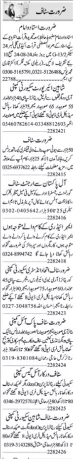 Private Company jobs advertisement dated about 22 August 2024 in daily Dunya Newspaper invites application for the vacant post of laundry canteen staff, call operator, security staff, supervisor, teacher, office boy, manager, subedar major, havaldar, pesh imam, security guard, sipahi, factory worker, hafiz e quran, jco, naik, accountant, naib subedar, embroidery worker, subedar and clerk in Islamabad, islamabad Islamabad Pakistan. Candidates with B.com, Matric, Bachelor, Intermediate, Middle, BBA and BA etc. educational background will be preferred.