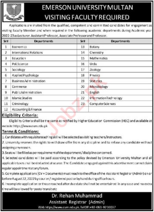 Vacancies in Emerson University Multan Advertisement August 2022