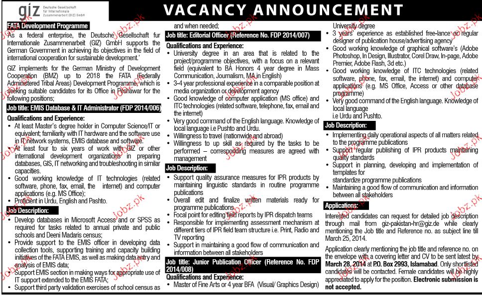 Apply as per details in job advertisement. Login to view further details of how to apply via https://www.jobz.pk online.