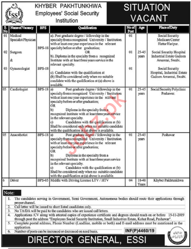 Khyber Pakhtunkhwa Employees Social Security Institution is seeking applications from medical, health, mbbs, doctors and experienced candidates for the positions of Medical Specialist, Physician, Surgeon, Gynecologist, Cardiologist, Anesthetist, LTV Driver and HTV Driver in Peshawar KPK 2019.