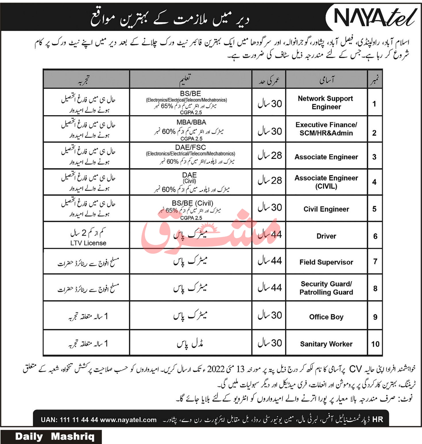 Nayatel Pvt Limited Upper Dir, upper dir and lower dir Khyber Pakhtunkhwa KPK Pakistan invites applications from eligible candidates for the post of sanitary worker, executive hr admin, security guard, driver, executive scm, executive finance, civil engineer, associate engineer, associate engineer civil, field supervisor, network support engineer, office boy and patrolling guard as per advertisement of April 29, 2022 published in daily Mashriq Newspaper. Persons with MBA, Middle, Intermediate, Matric, BBA, DAE and B.E etc. education can apply.