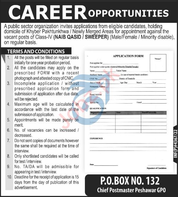 Public Sector Organization jobs advertisement dated about 29 July 2022 in daily Aaj Newspaper invites application for the vacant post of sweeper and naib qasid in Peshawar, peshawar Khyber Pakhtunkhwa KPK Pakistan. Persons with Primary, Matric and Middle etc. education can apply.