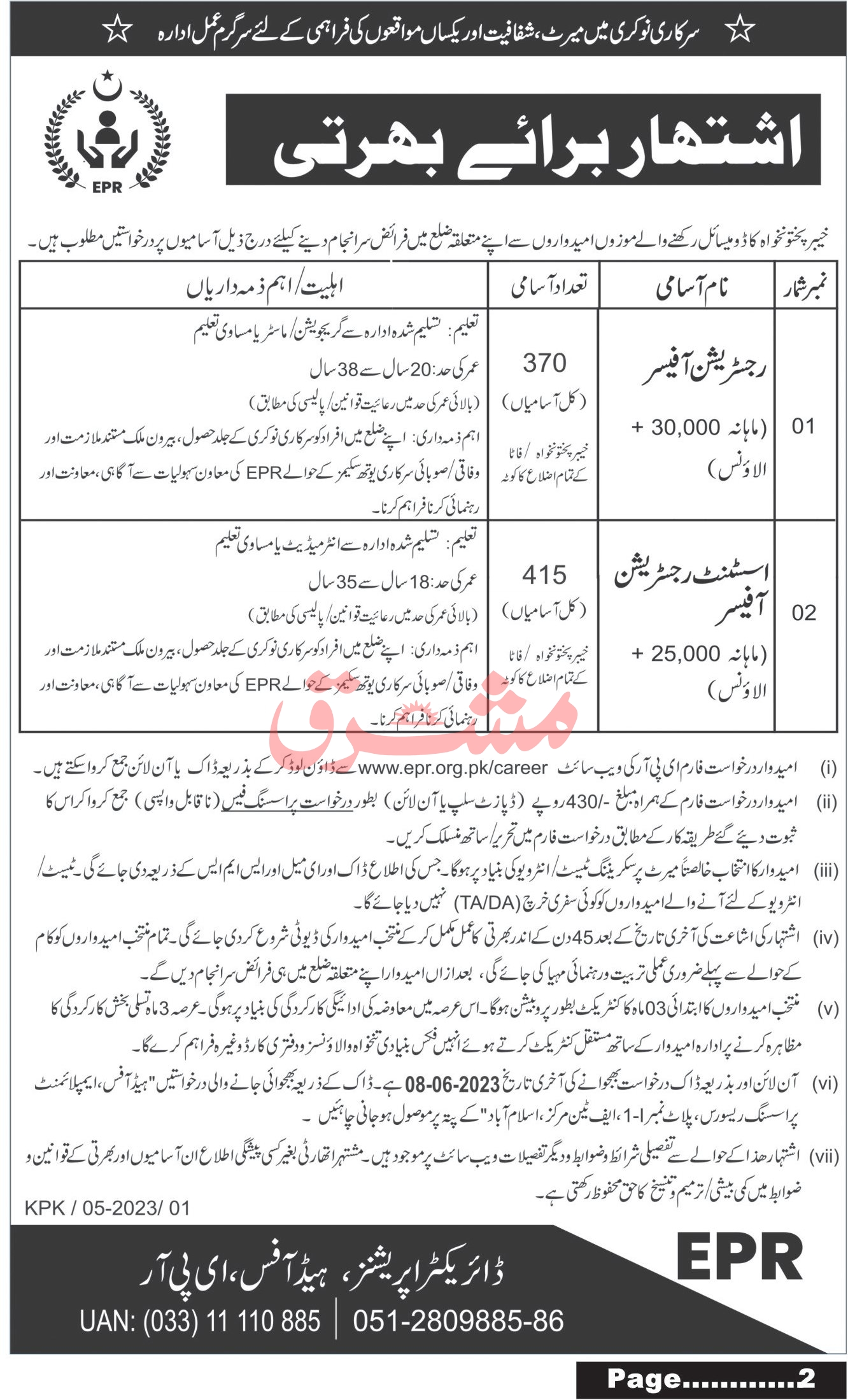 Employment Processing Resource EPR jobs advertisement dated about 20 May 2023 in daily Mashriq Newspaper invites application for the vacant post of registration officer and assistant registration officer in Peshawar, peshawar Khyber Pakhtunkhwa KPK Pakistan. Candidates with Bachelor and Master etc. educational background will be preferred.